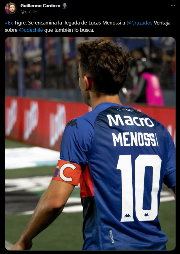 “Se encuentra encaminada la llegada de Lucas Menossi a Universidad Católica. Ventaja sobre Universidad de Chile, que también lo quiso” dio a conocer desde el otro lado de la cordillera, con lo cual la UC podría empezar a asegurar un volante de salida para la temporada 2024.